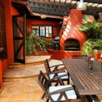Terraza techada con comedor exterior con horno de leña