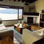 Sala con chimenea. Vista al lago